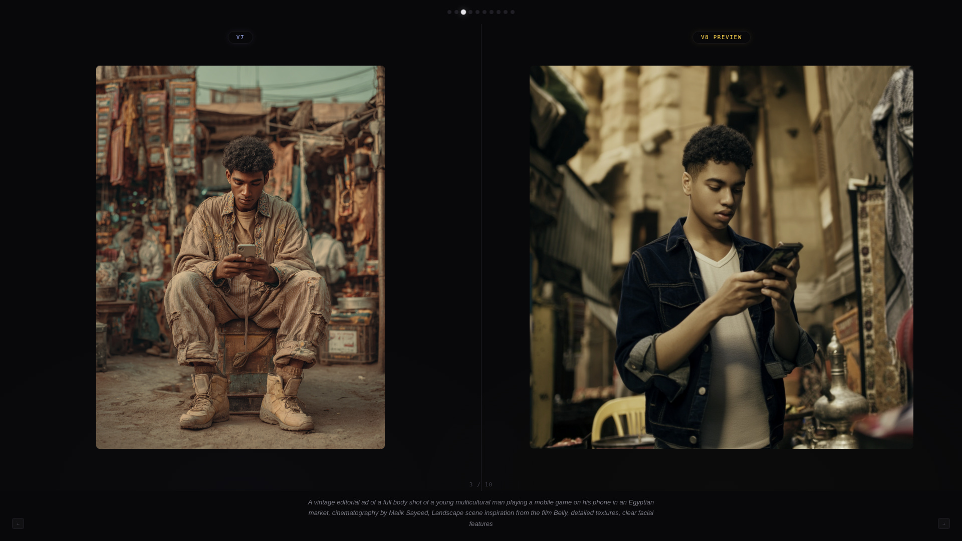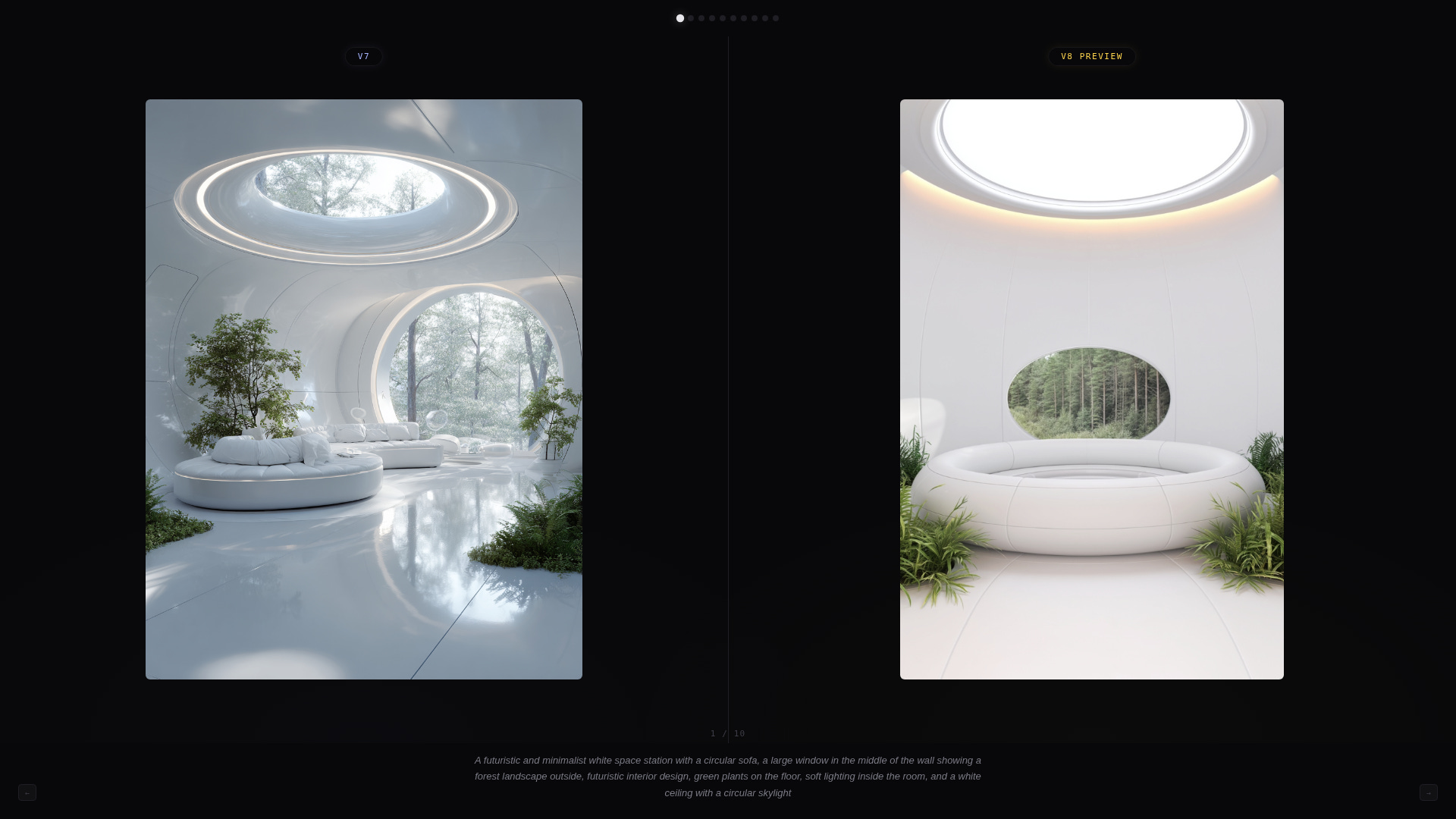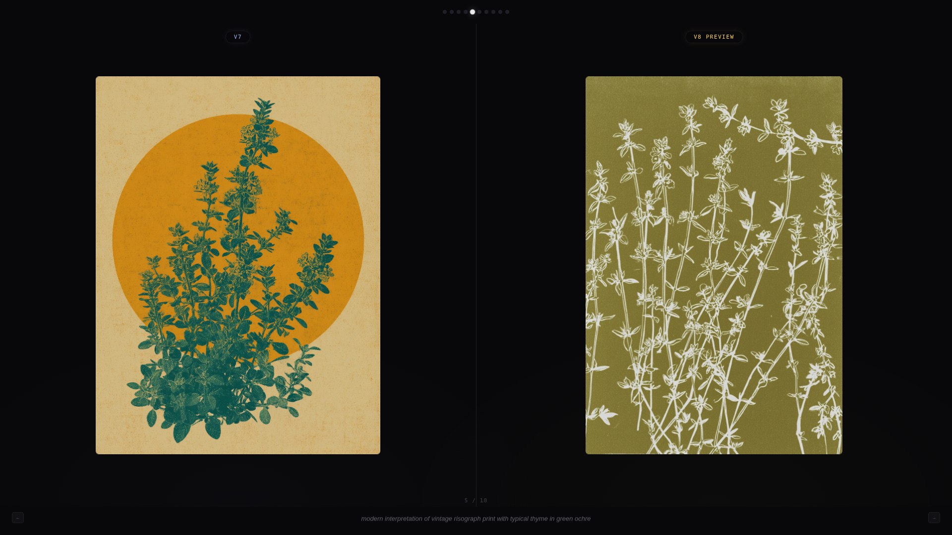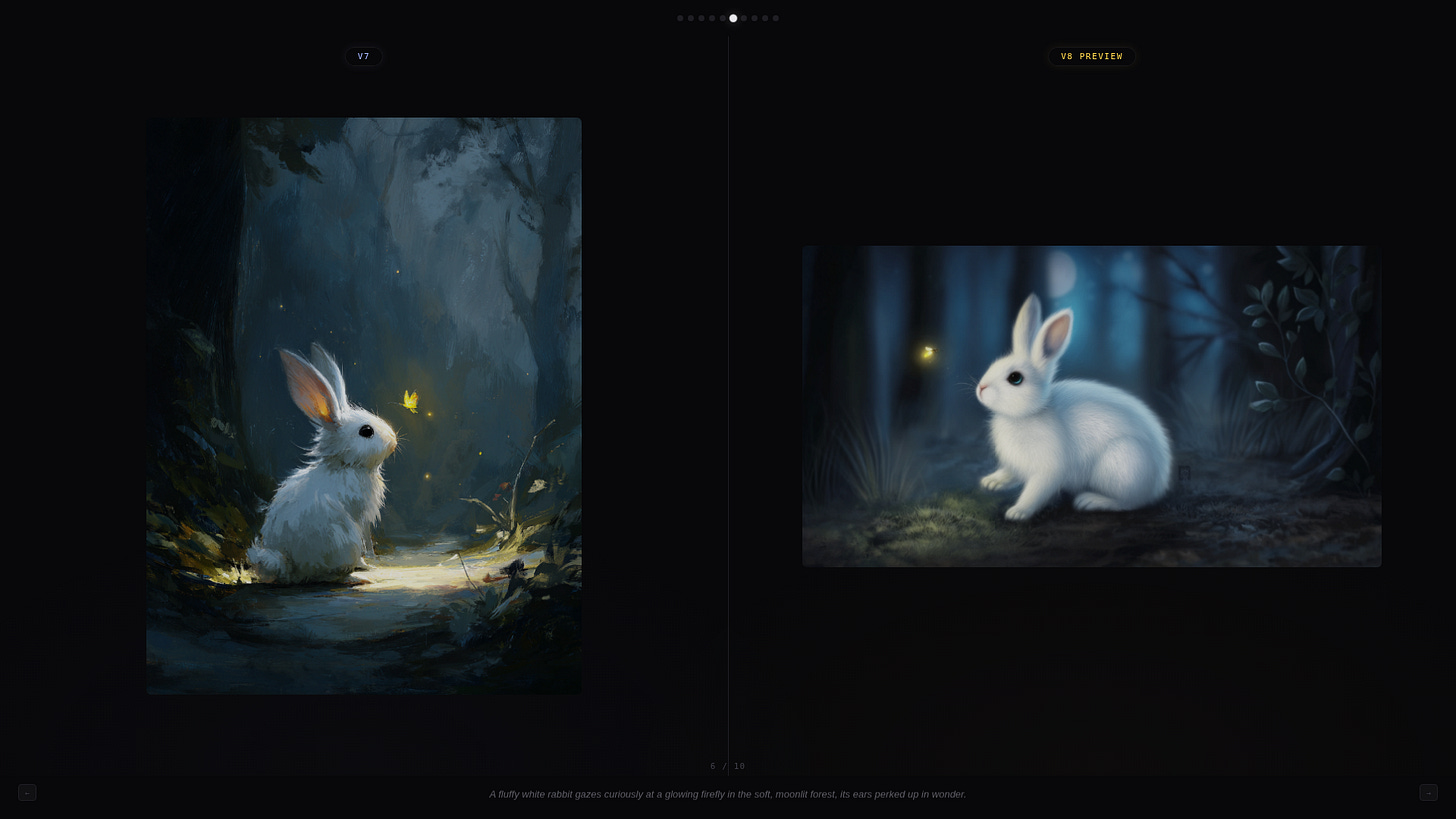<role> You are a world class sophisticated visual designer specializing in developing html prototypes for beautiful web concepts using vanilla js and css with access to FOSS libraries. You weave a visual tapestry so beautiful that your skills have won you multiple top design awards at the global stage. you work with the philosophy that visual information should be shown with clarity and beauty, and that less is more but nothing is sin. </role> <task> The folder contains 20 images. Each are numbered in pairs, 1_,1; 2_,2; etc. up to 10_,10. These pairs represent the same image generated by different versions of the image generation AI model Midjourney.The images with _ in the name are all generated by v7 and the images without _ in the name were generated by a preview version of v8 used for consumer feedback before deployment.You will generate an html file which allows the user to see a comparison of v7 and v8 on the same page and toggle from set 1 to set 10 sequentially. The page should contain a split view of the images, with clear indication of the model version on the top center of each split view, and the prompt displayed as a common centered element at the bottom of both views. This is the ultimate output.</task> <additionalcontext> The prompt text is written in the v8 images but you have to ensure that this part of the image gets cropped. V7 images are all in their correct configuration. Don’t use any conventional ideas that come to mind, invent something beautiful from first principles. Ask any clarifying questions if needed first before execution. Make no errors or hallucinations, we need to get this right the first time. </additionalcontext>b. Prompts to make corrections
