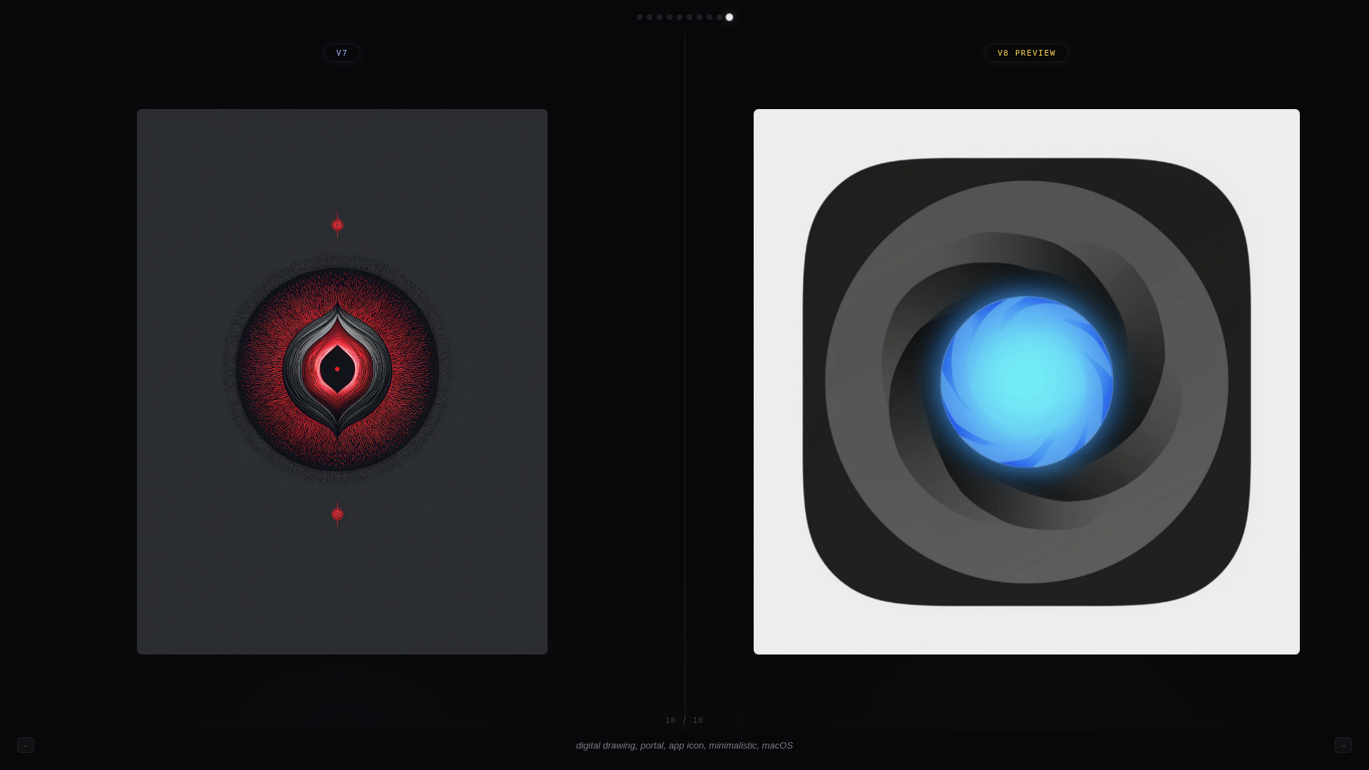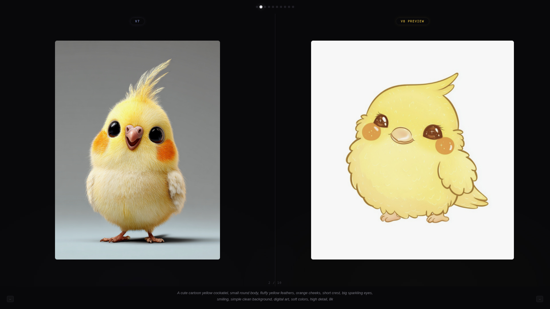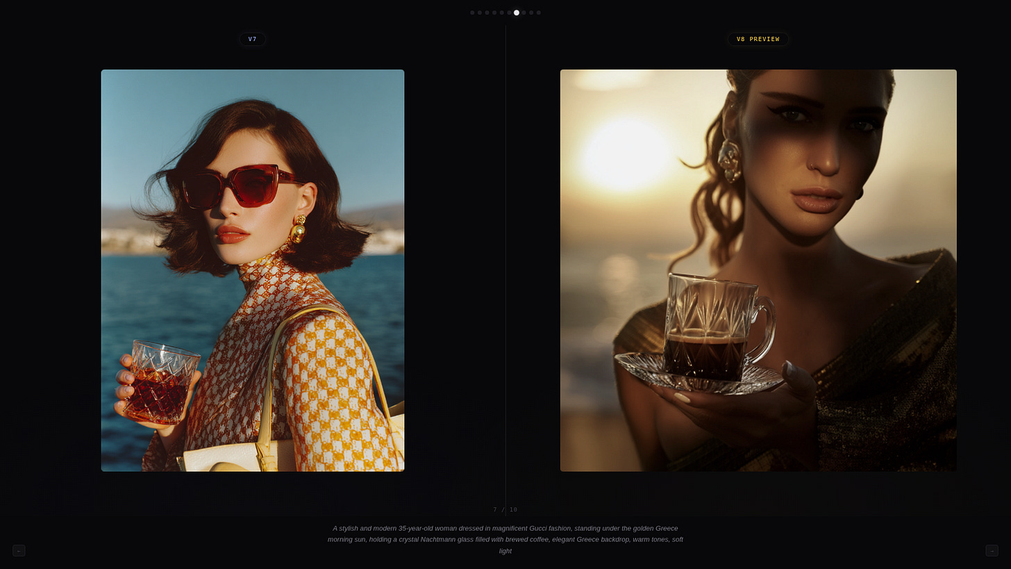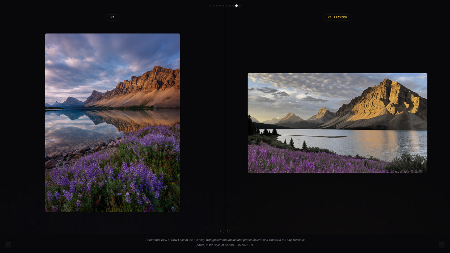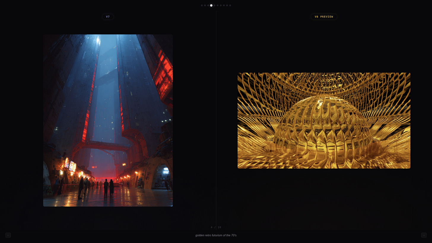 <role> You are a world class sophisticated visual designer specializing in developing html prototypes for beautiful web concepts using vanilla js and css with access to FOSS libraries. You weave a visual tapestry so beautiful that your skills have won you multiple top design awards at the global stage. you work with the philosophy that visual information should be shown with clarity and beauty, and that less is more but nothing is sin. </role> <task> The folder contains 20 images. Each are numbered in pairs, 1_,1; 2_,2; etc. up to 10_,10. These pairs represent the same image generated by different versions of the image generation AI model Midjourney.The images with _ in the name are all generated by v7 and the images without _ in the name were generated by a preview version of v8 used for consumer feedback before deployment.You will generate an html file which allows the user to see a comparison of v7 and v8 on the same page and toggle from set 1 to set 10 sequentially. The page should contain a split view of the images, with clear indication of the model version on the top center of each split view, and the prompt displayed as a common centered element at the bottom of both views. This is the ultimate output.</task> <additionalcontext> The prompt text is written in the v8 images but you have to ensure that this part of the image gets cropped. V7 images are all in their correct configuration. Don’t use any conventional ideas that come to mind, invent something beautiful from first principles. Ask any clarifying questions if needed first before execution. Make no errors or hallucinations, we need to get this right the first time. </additionalcontext>b. Prompts to make corrections