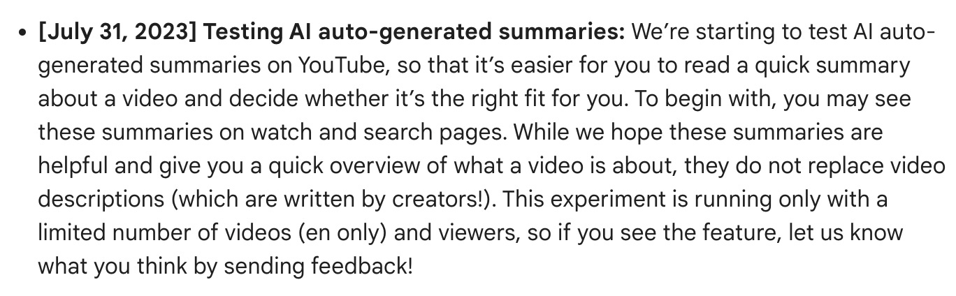 The second feature is AI auto-generated summaries for videos. These summaries are different and are over and above the video descriptions that are written by the creators themselves. Imagine having this feature handy when you have 10 minutes for a 40 minute video, or when you are trying to see whether a video is worth your time or not. Super excited for this feature!